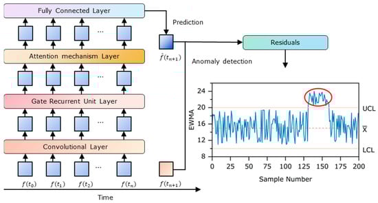 The anomaly detection model based on CNN–GRU–Attention and the EWMA control chart proposed in this paper can effectively detect the anomaly of the time series data generated in the tool machining process. The structure of this anomaly detection model is shown in Figure 2.