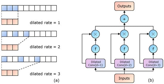 A CNN can be divided into one-dimensional CNN models and multidimensional CNN models. In this case, a one-dimensional CNN model was chosen to process the sensor time series data generated during the tool processing to extract the temporal features. The temporal data patterns generated during the tool cutting process are complex, and multiple-dimensional feature correlations exist among each data point. When using a simple one-dimensional convolutional network to extract features from the tool processing, it is difficult to fully extract the features of different dimensions in the temporal data. However, adding too many layers to the network may lead to overfitting. To solve this problem, a parallel dilated convolution model is used for convolutional operations. The dilated convolution model uses dilated kernels as parallel convolution units. Compared to regular convolution, dilated convolution increases the receptive field by adding holes in the kernels, and different dilated rates result in different receptive fields, allowing the model to capture multi-scale data information. The structure of the dilated convolution model is shown in Figure 3a. The dilated rate (d) of 1 corresponds to standard convolution, and when , the dilated convolution kernel expands the receptive field.