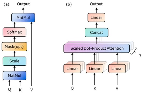 The structure of the self-attention mechanism is shown in Figure 5a. The self-attention mechanism requires three input parameters—query, key, and value—where query represents the objective function, key represents the correlation between input data, and value represents the specific numerical values of the input data. Firstly, calculate the correlation between query and key to obtain the raw score, which is commonly achieved using methods such as dot product and cosine similarity. Scale the raw score and normalize it using the SoftMax function, which maps the score to a range between 0 and 1, to obtain the weight coefficient. The attention value is obtained by the weighted summation of value according to the weight coefficient, defined as []: