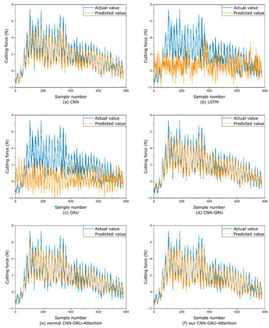 The prediction results of our CNN–GRU–Attention model and the above comparison prediction models for the cutting force data of the disc tool are shown in Table 4, which shows that our proposed CNN–GRU–Attention model achieves the best prediction accuracy. To demonstrate the predictive performance of the models more intuitively, a comparison between the predicted values and the valid values of 780 data points at the same positions from each model’s prediction data is shown in Figure 8. In these figures, the blue curve represents the true values of the cutting force data, while the yellow curve represents the predicted values. The x-axis represents the corresponding time of the data, and the y-axis represents the numerical value of the cutting force.