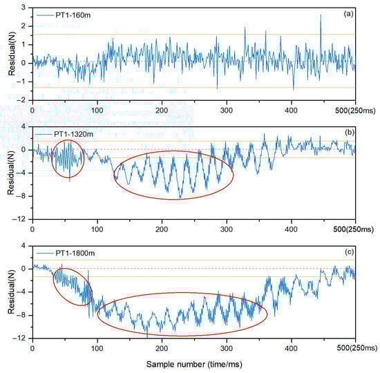 The EWMA control charts of cutting force residual sequences, plotted based on the machining process of disc tools with different processing lengths, are shown in Figure 10. Figure 10a shows the EWMA control chart of a disk tool after processing for 160 m. In this situation, most of the data points fall within the control limits of the EWMA statistical chart. Figure 10b shows the EWMA control chart of a disk tool after processing for 1320 m. At the beginning of the cutting process, the residual sequence experiences significant fluctuations as the first red circle marked, indicating the occurrence of the chatter phenomenon during the current cutting process and leading to noticeable high-frequency fluctuations in cutting forces. Subsequently, after entering a stable cutting process, the residual sequence consistently exceeds the control limits of the control chart for multiple consecutive values as the second red circle marked. This signifies that the cutting force of the current tool is far beyond the range of normal cutting forces. By analyzing the aforementioned changes, the occurrence of abnormal tool wear can be successfully detected. Figure 10c shows the EWMA control chart of a disk tool after processing 1800 m. Similar to the situation in Figure 10b, the control chart can also recognize the abnormal state of the current tool based on the changing characteristics of the data. Timely detection of cutting forces enables manufacturers to promptly identify the abnormal state of the tool and replace it, reducing unnecessary material waste and ensuring the quality of the machined products. EWMA control charts need to assume that the residual sequence obeys a normal distribution, and the possible skewed distribution of data will lead to performance degradation. At the same time, their performance depends on the choice of the smoothing parameter (λ), and exploring the adaptive adjustment method of parameters may improve the flexibility of the model.