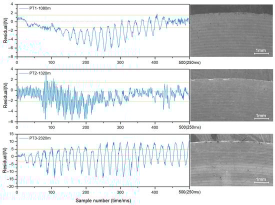 We conducted anomaly detection on three different tools subjected to three distinct pre-treatment processes, measuring the machining distance at which significant anomalies occurred, as shown in Figure 11. PT1 served as the control group and exhibited anomalies first. PT2 underwent hardness enhancement and exhibited anomalies at approximately 1320 m of machining distance. PT3 underwent toughness enhancement and exhibited anomalies last at 2320 m. The above anomaly detection results are consistent with the conclusions from our previous research [], indicating that the anomaly detection model has good performance. By examining the corresponding tool images, it can be observed that PT1 has low hardness and poor wear resistance, with continuous wear on the cutting edge. PT2 has high hardness but a large grain size and low toughness, resulting in large material defects. PT3 has good toughness and a uniformly fine grain size, superior wear resistance compared to PT1, and no large material defects, demonstrating better wear resistance performance.