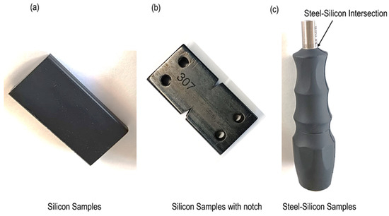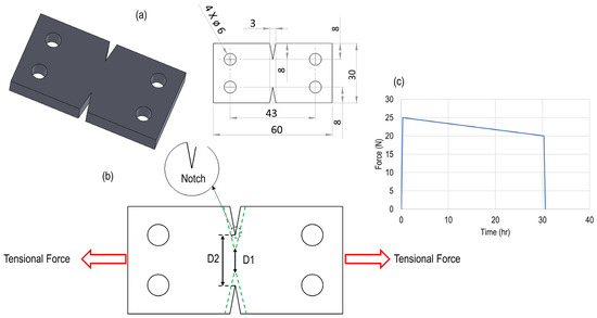 To evaluate the impact of the cleaning, disinfection, and sterilization processes on the mechanical properties of the silicone samples, a notch growth test under loading was performed. In this method, identical loading and load-holding conditions were applied to the samples both before and after the cycling process to assess the extent of notch propagation. It was hypothesized that repeated processing would degrade the mechanical integrity of the material, thereby facilitating further notch growth under the applied loading. This approach allows for a comparative assessment of the material’s resistance to crack propagation and mechanical deterioration as a result of the sterilization cycles.