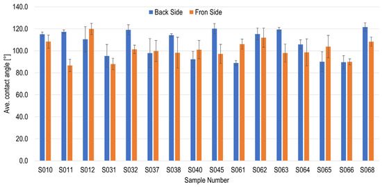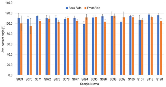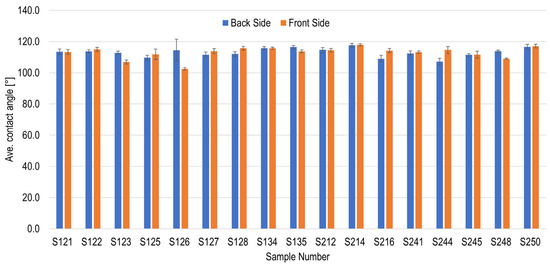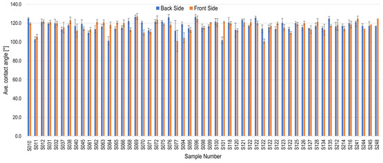 Figure 5 indicates the initial contact angle results for the silicone samples prior to starting the cleaning, disinfection, and sterilization process. The measured contact angles ranged from 110 to 120° for the majority of the samples. The surface exhibited a high degree of hydrophobicity, which was anticipated given the use of silicone rubber. The standard deviation was predominantly less than 5°, indicating that the measured values exhibited minimal variability and can thus be regarded as reliable. However, the contact angle of some samples was found to be significantly smaller, with an average measurement ranging from 100 to 110°. Furthermore, an elevated standard deviation was observed in the individual samples, indicating significant variations in their measured values. This phenomenon could be attributed to the presence of a partially heterogeneous sample surface, which was discernible to the naked eye. In such instances, it becomes imperative to meticulously examine the manufacturing process or to consult with the manufacturer of the silicone rubber, as deemed necessary, in order to enhance the manufacturing process.