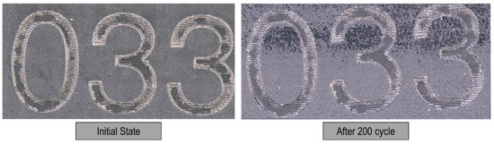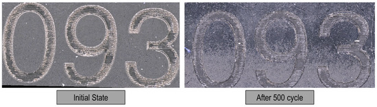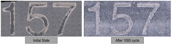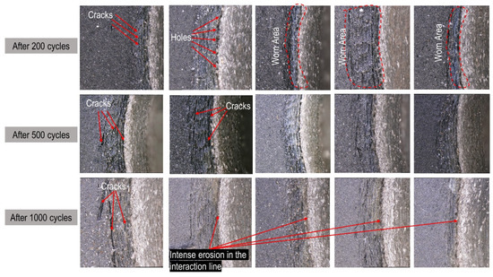 Figure 11 shows the overall condition of the examined surface before and after 1000 cycles, indicating that erosion had progressed over a larger area, eventually leading to a more uniform surface appearance across the worn regions.