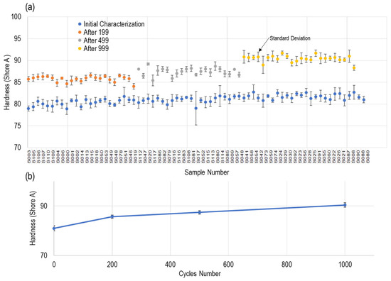 Figure 13 presents the hardness values of the samples subjected to 200, 500, and 1000 cycles.