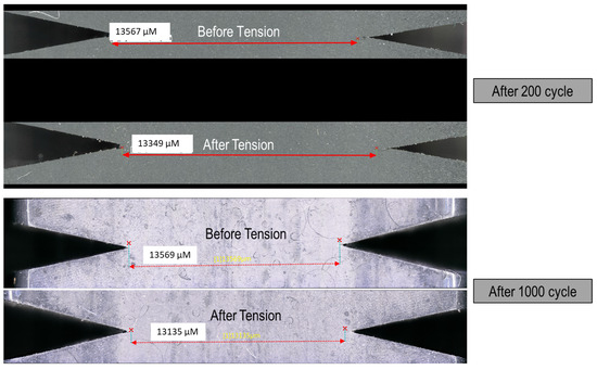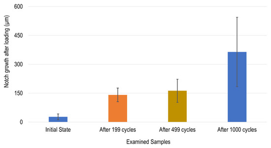 Figure 14 presents the measured notch distances after 200 and 1000 cycles, highlighting a significant difference in notch growth between the two sets of experiments. This indicates that prolonged processing notably influences the material’s susceptibility to crack propagation.
