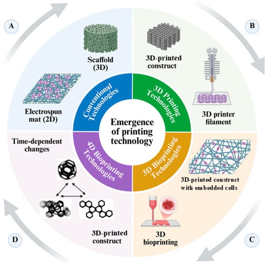 Printing technologies evolved regenerative medicine and tissue engineering. (A) Tissue engineering is based on the utilization of standard technologies, such as 3D scaffolds and 2D electrospun mats. (B) 3D-printing technology developed the use of printable filaments to produce 3D items. (C) By adding biological elements to 3D-bioprinting, structures with living cells can be created, increasing their biological importance and functional potential. (D) 4D -bioprinting allows for intelligent, responsive behaviors that mimic the characteristics of genuine tissues by incorporating time-dependent alterations into printed objects.