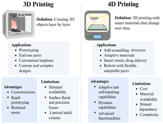 The enhanced ability of biomaterials to dynamically react to external stimuli significantly increases the potential of 4D-bioprinting [74]. These materials need to undergo structural and functional changes for applications such as tissue regeneration, which is crucial for improving cellular connections and enhancing biocompatibility. By leveraging the capabilities of 4D-bioprinting technology, we can create living, flexible tissues that effectively respond to their physiological environment, leading to a paradigm shift in biofabrication [75]. Additional advantages of 4D-bioprinted dynamic structures that improve the regeneration of complex tissues like cardiac muscle and cartilage include improved cellular connections and increased biocompatibility [76]. By transforming 3D-printing from static models to living, breathing entities that can respond to their environment, 4D-bioprinting represents a paradigm shift in biofabrication [77]. It is anticipated that this innovation would significantly increase the efficacy of tissue engineering techniques by opening the door for the development of materials and structures that more accurately mimic the complexities of human tissues. 4D-bioprinting is setting the standard for next-generation medical solutions by fusing contemporary materials science with biofabrication concepts [78]. Its objective is to bridge the gap between clinical application and laboratory research. Figure 2 illustrates the benefits and limitations of both 3D and 4D-bioprinting and their impact on biomedical engineering. Traditional 3D-bioprinting allows for the layer-by-layer construction of static structures used to create complex prototypes, customized implants, and medical equipment. Its main advantages include design freedom, rapid prototyping, and reduced production waste [79]. However, limitations include restricted construction volumes, surface smoothness and resolution issues, and material availability.