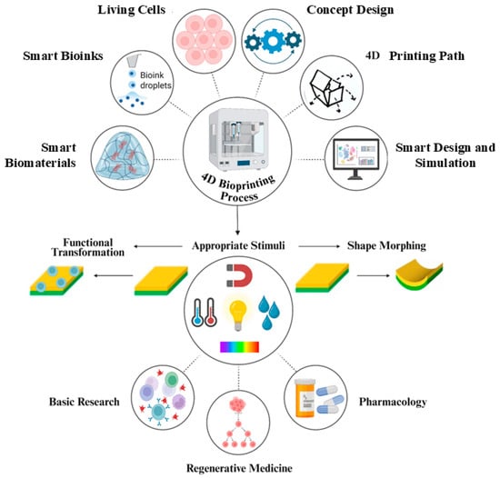 Live cells, intelligent bioinks and biomaterials, printing pathways, conceptual design, intelligent design, and simulation software represent the key components of the 4D-bioprinting process. These elements work together to enable the formation of structures that react to environmental conditions, such as variations in temperature, humidity, light, pH, and magnetic fields; the printed structures alter in shape and function. Its downstream applications include pharmacology, basic research, and regenerative medicine.