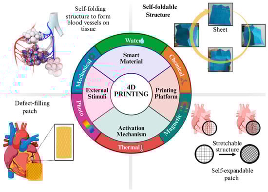 The external applications demonstrate the practical implications of this interaction. For instance, self-folding structures for vascular tissue engineering use thermally or chemically induced folding to create perfusable blood vessels within tissue scaffolds [151]. Self-foldable sheet structures illustrate the transformation of flat designs into 3D forms, enabling deployable patches or implants that aim to reduce surgical invasiveness [152]. The defect-filling cardiac patch shows how 4D-bioprinting can address congenital heart defects or myocardial infarctions. These printed patches can expand or adapt to irregular anatomical locations, making them valuable for medical applications. The implants made from water-responsive or magnetic materials can adjust to the surrounding tissue mechanics through their elastic and self-expanding nature [153]. This adaptability is crucial for developing next-generation bioelectronic interfaces and adaptive prostheses. The following section discusses the main potential applications of 4D-bioprinting in sustained drug delivery systems (Figure 4).