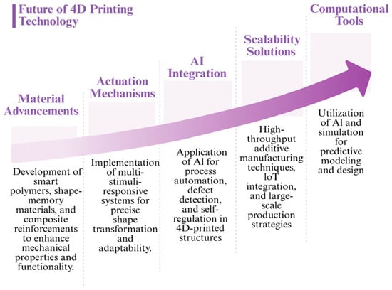 Biocompatible materials must be incorporated into 4D-printed structures to guarantee that the medication delivery system is well-tolerated by the body [174]. Biopolymers such as alginate, chitosan, or gelatin are utilized to ensure that the printed structures are compatible with biological systems. By altering these materials to increase their bioactivity or mechanical properties, the drug delivery system may be even more successful [175].