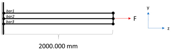 Geometry and boundary conditions for the three-bar multi-material system. The assembly consists of three parallel bars of 2000 mm length fixed at the left end and joined at a common interface on the right. An axial force, F, is applied to this common interface to induce uniform axial displacement.