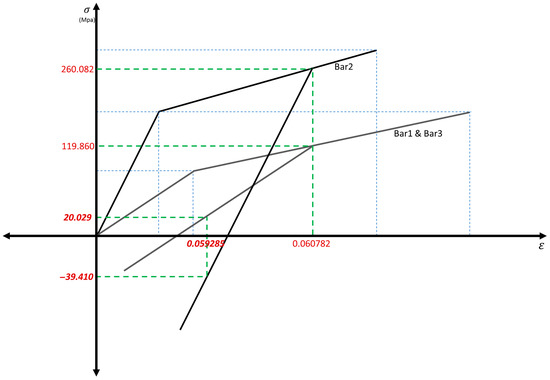 Material property distribution across the three-bar configuration, illustrating the bilinear stress–strain response for each component. The outer bars (Bar 1 and Bar 3) have a lower yield strength (100 MPa) compared to the central bar (Bar 2, 200 MPa), creating a heterogeneous system designed to produce residual stresses upon unloading.