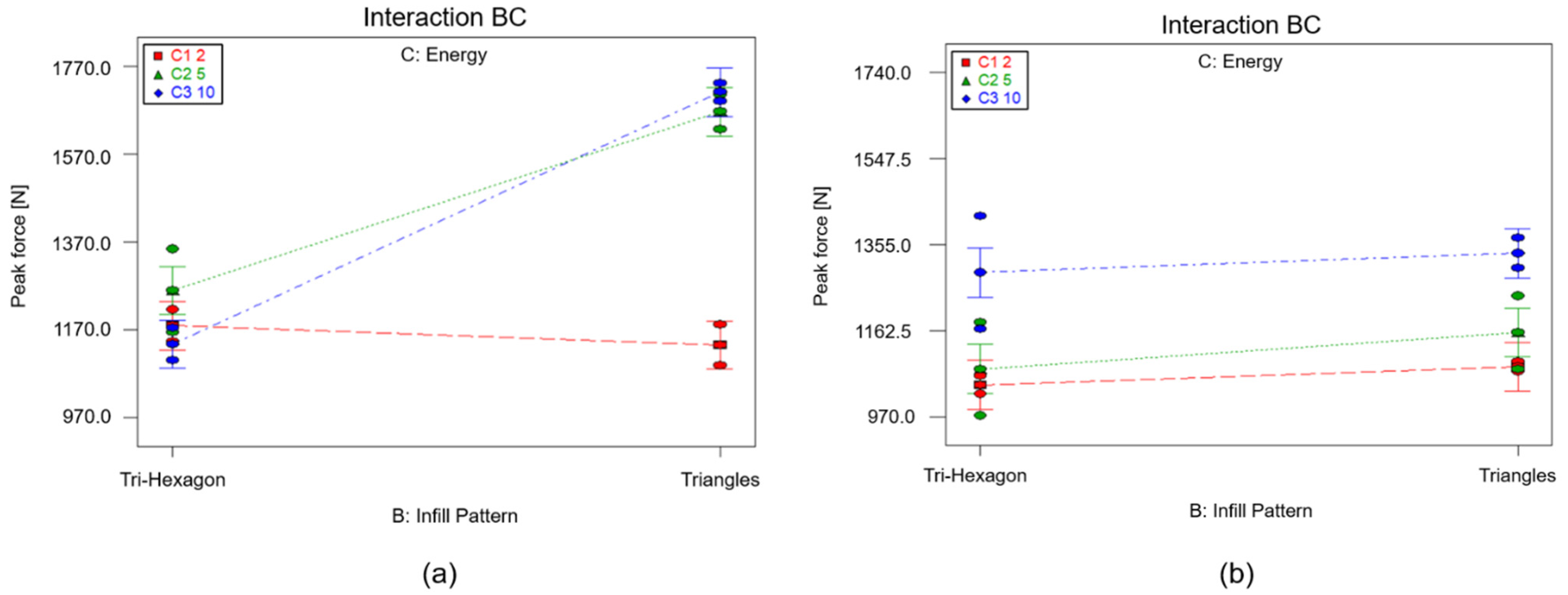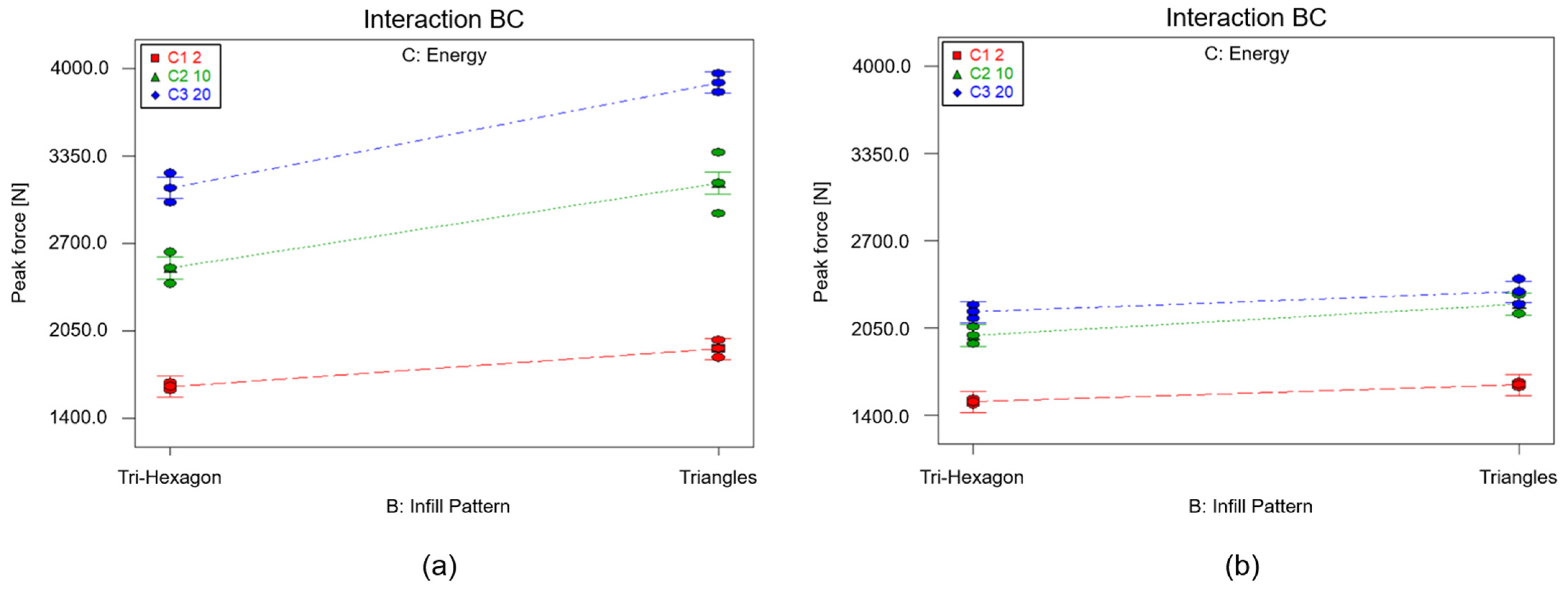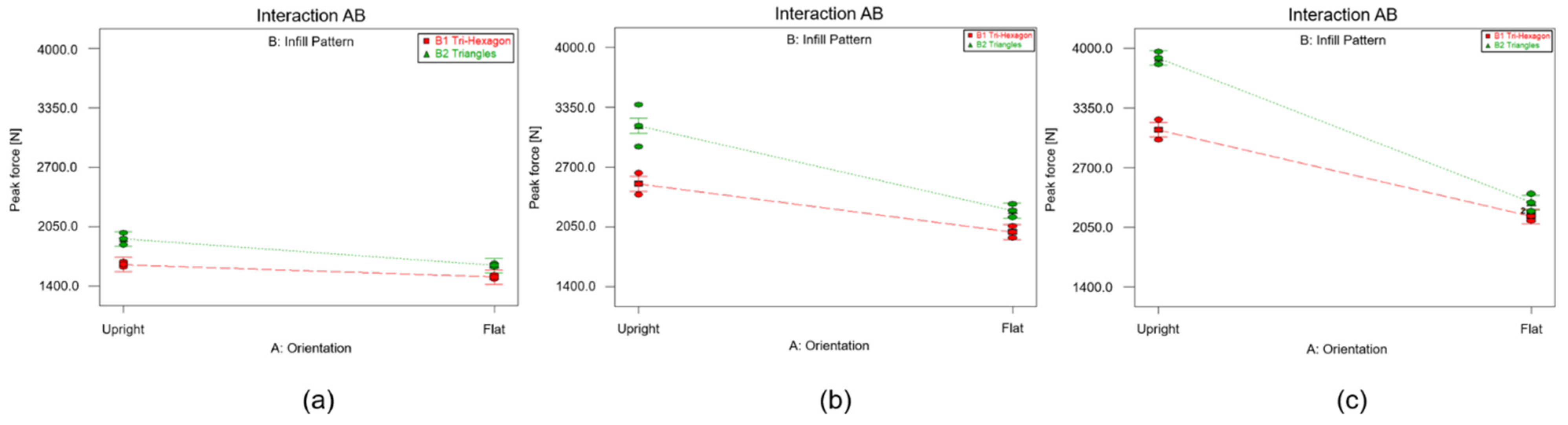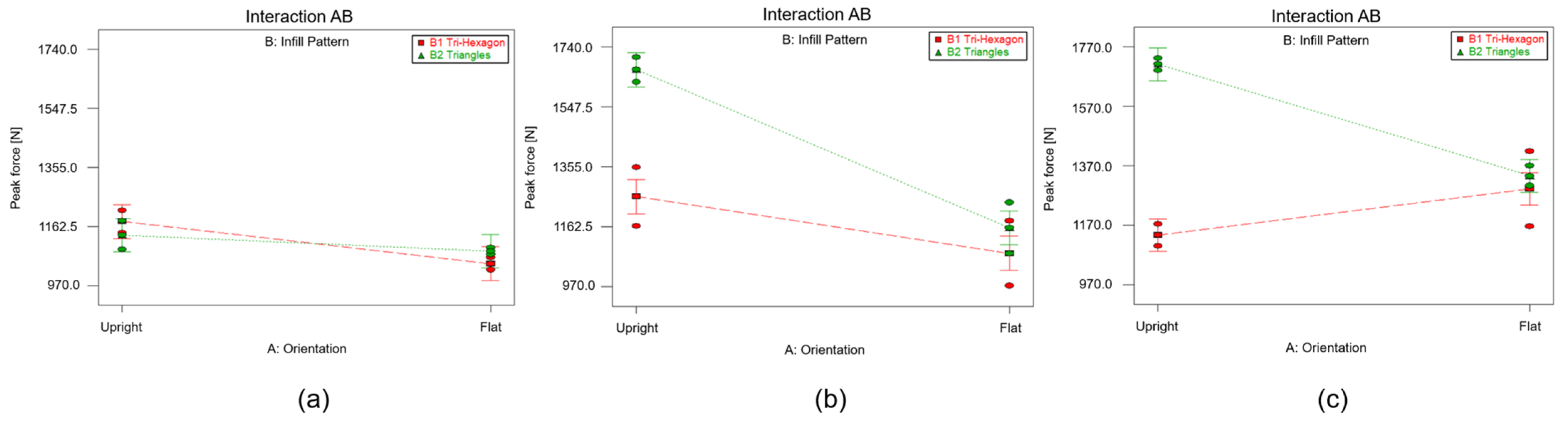 - Infill Pattern (factor B)—Categorical factor varied at two levels (b = 2) corresponding to {trihexagonal, triangular};