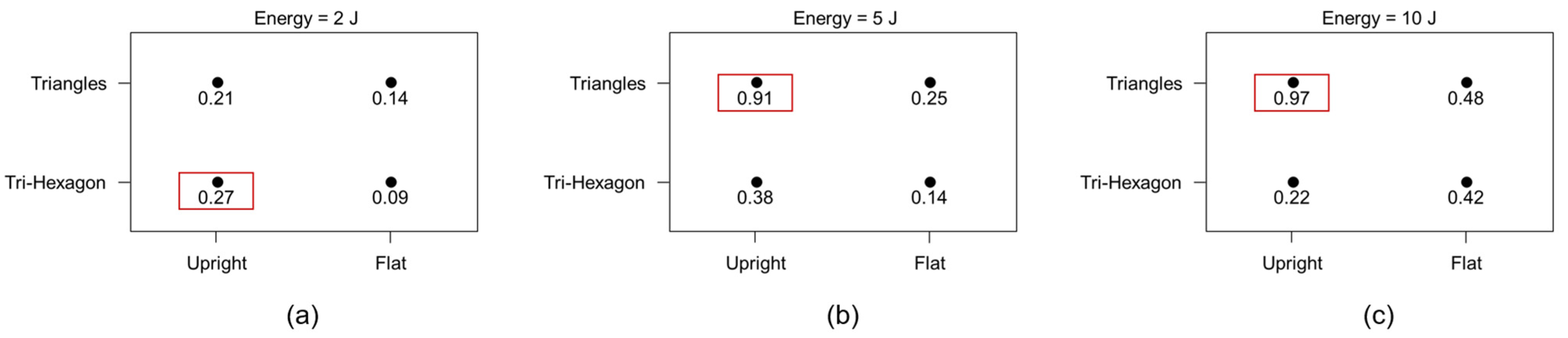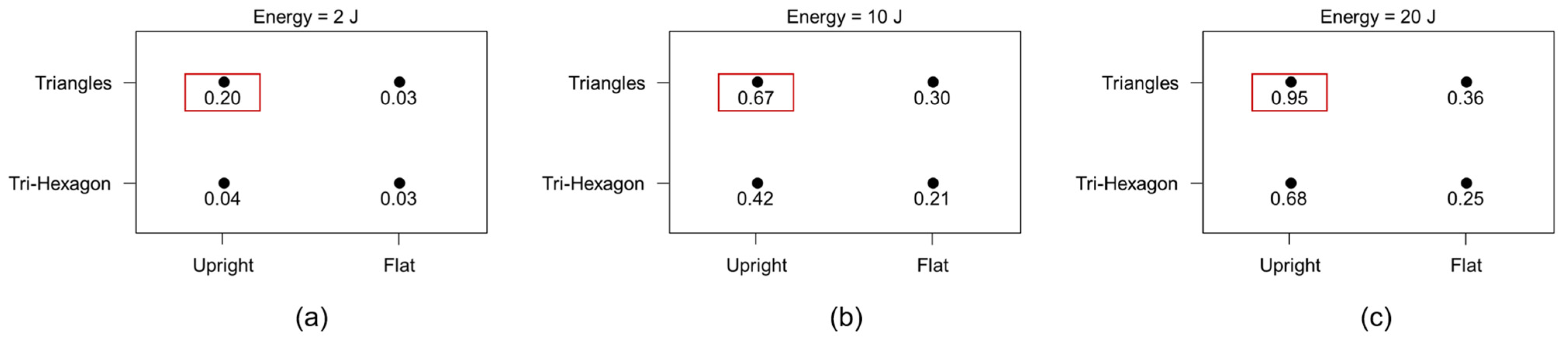 - Energy (factor C)—Numerical factor varied at three levels (c = 3) corresponding to {2, 10, 20} J.