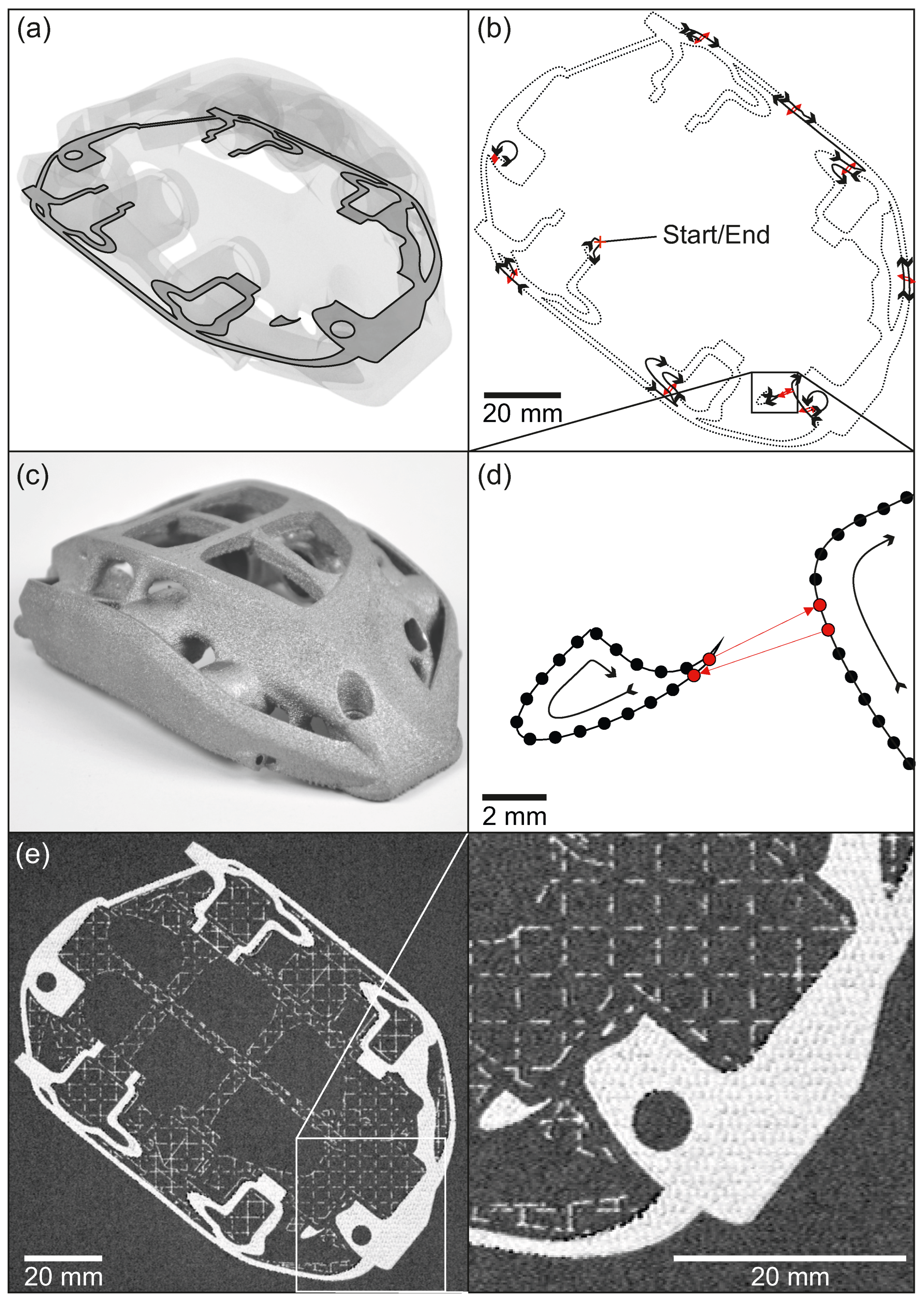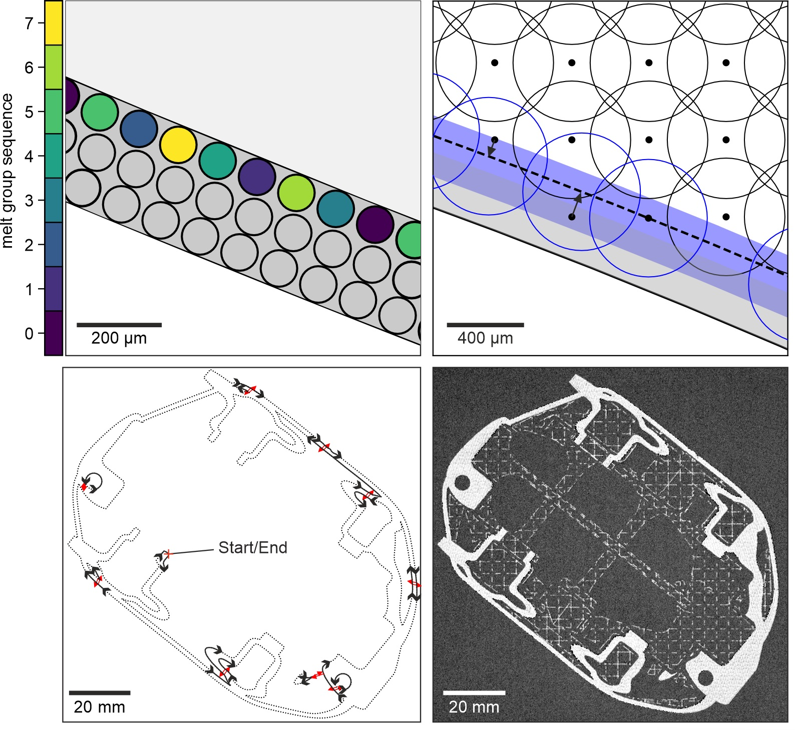 - Kupfer, T.; Leimbach, S.; Spano, L.; Pohl, S.; Körner, C.; Markl, M. Spot melting sequences for complex geometries in electron beam powder bed fusion. Prog. Addit. Manuf. 2025. [Google Scholar] [CrossRef]