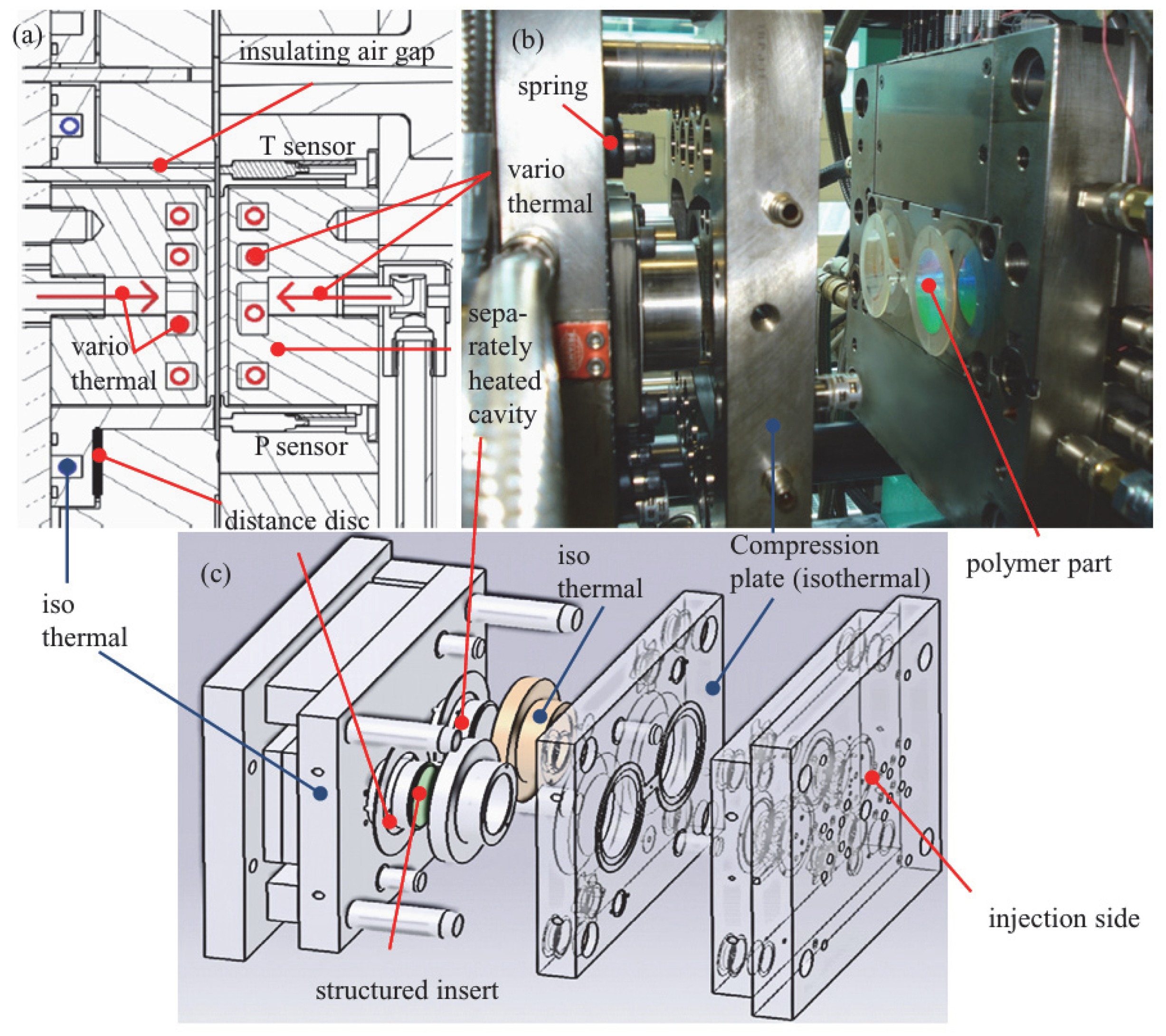 - Rytka, C.; Kristiansen, P.M.; Neyer, A. Iso- and variothermal injection compression moulding of polymer micro- and nanostructures for optical and medical applications. J. Micromech. Microeng. 2015, 25, 065008. [Google Scholar] [CrossRef]