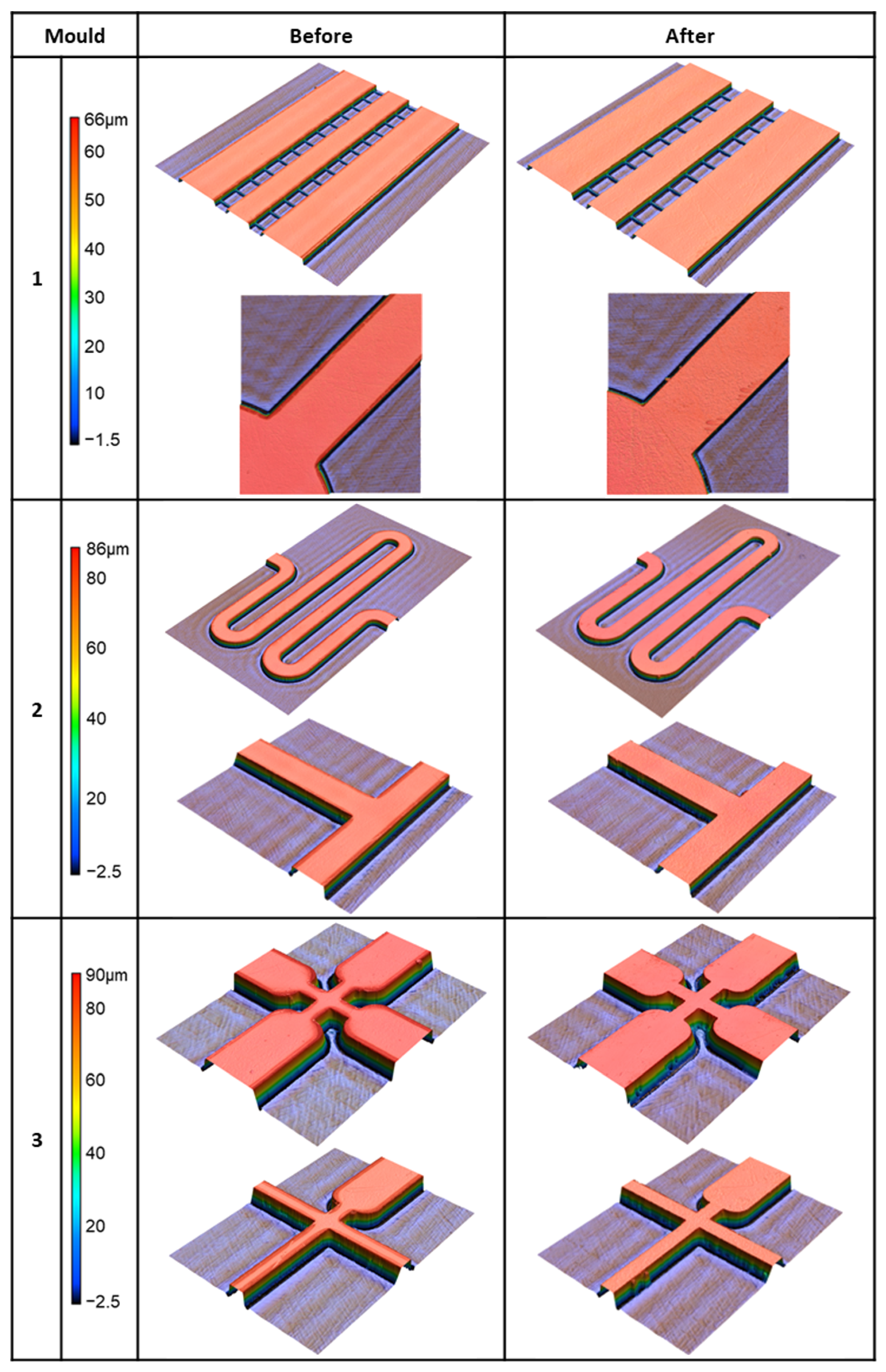 | 3 | 60 µm | 63.19 ± 0.10 µm | 5.3% | 62.92 ± 0.04 µm | −0.4% | 61.71± 0.53 µm | −2.0% | |