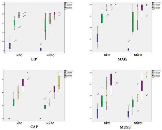 Scores of the auditory perceptive and linguistic abilities for the two populations at the different moments (the lower and upper dashes of the boxplot indicate the minimum and maximum observed values except for outliers, the box represents the interquartile range 25–75% and the bold dash inside the box is the median value, the circle represents the outliers and the asterisk represents the extreme values). LIP (Listening-in-Progress Profile), MAIS (Meaningful Auditory Integration Scale), CAP (Categories of Auditory Performance), MUSS (Meaningful Use of Speech Scale), NFC (native family’s children), and NNFC (non-native family’s children).