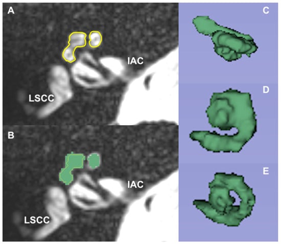 This is a screen obtained from the 3D reconstruction software (3D Slicer, version 4.8.0). Box (A) is an axial view obtained prior to the 3D reconstruction of the cochlea. The yellow line highlights the boundaries of the basal turn of the cochlea. Box (B) is the defined area of the cochlea (green) that was used to calculate the volume. Box (C) is the superior view of a normal cochlea (patient without a history of meningitis). Box (D) is the anterior view of a normal cochlea from the 3D reconstruction. Box (E) is the anterior view of a cochlea from a patient with history of meningitis (for comparison). (Legend: IAC = internal auditory canal, LSCC = lateral semicircular canal).