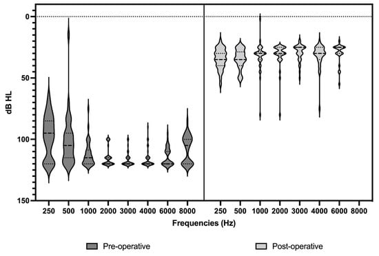 Graph of grouped hearing thresholds for every frequency from 250 Hz to 8000 Hz, both pre- and post-operatively.
