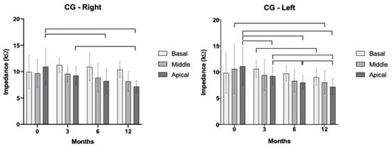 We conducted a statistical analysis for each cochlear region by differentiating electrodes into their basal, middle, and apical segments (Figure 3 and Figure 4). According to our results, there was a tenuous increase in the basal electrodes’ impedance from t0 to t3 (p > 0.05). We also observed a decreased impedance of the middle electrodes from t0 to t3, except for MP1+2 mode on the right ear, for which we observed an increased impedance value (from t0 to t3). Yet, for the apical electrodes’ impedance, there was a decrease in the averaged values from t0 to t3, although it was significant only in CG mode for the left ear (p = 0.03). Interestingly, the electrodes’ impedance of the apical portion decreased from t0 to every other moment of analysis, for both ears and for both modes (CG and MP1+2), and it was significantly reduced from t0 to t6 and t12.