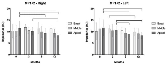 Histograms depicting average values of the impedances in MP1+2 mode in various cochlear segments, according to evaluation times. In brackets, groups with significant variations are shown.