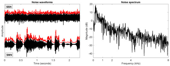 Examples of SSN (top left) and SMN waveforms (bottom left) and their spectra (right). The temporal envelopes of the noise maskers are also displayed in red, offset from the waveforms for better illustration.