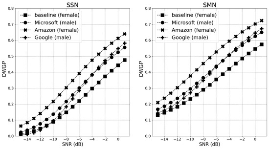 The intelligibility of the voices in the noise conditions was estimated using an object intelligibility model—Distortion-Weighted Glimpse Proportion (DWGP, [31])—as the first approximation. Target speech and its masking counterpart are taken as the inputs for DWGP to generate auditory spectro-temporal (S-T) representations for the signals. Auditory analyses are performed by the model to determine the number of S-T regions in the speech signal with a local SNR above a 3-dB threshold, known as “glimpses”, at 34 frequencies that simulate auditory filtering. For each frequency band, the similarity between the clean target speech and speech-plus-noise mixture is also measured. The final predictive index is a logarithmically compressed linear combination of the glimpse quantities weighted by the similarity scores in their frequency bands. From 0 to 1, greater DWGP scores predict better intelligibility. Figure 2 displays the DWGP score of the estimated intelligibility as a function of SNR for the four voices in the chosen noise maskers. In Figure 2, each data point is an average of DWGP scores from the 100 MSP sentences in the same condition. The model predicted that “Amazon” performed consistently better than the other three voices at all SNRs tested in both SSN and SMN. “Google” and “Microsoft” were predicted to have similar intelligibility; “baseline”, i.e., the natural voice, was the least intelligible.