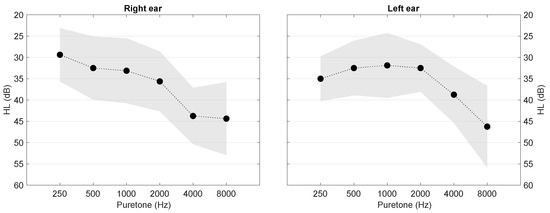 Average two-ear HLs (dB) of the eight HI listeners with symmetrical hearing loss at six octave frequencies. The solid circles and shades show the mean levels and the corresponding 95% confidence intervals, respectively.