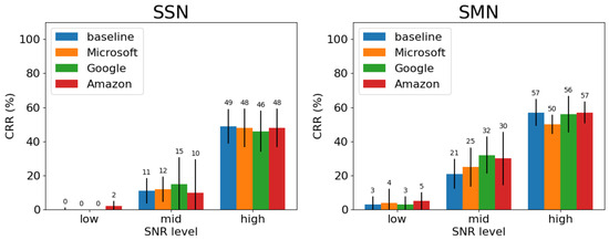 Figure 4 and Figure 5 show the average CRRs of participants for the four voices in different noise conditions for NH and HI listeners. For NH listeners, in SSN, “baseline” appears to be the least intelligible at the low and mid SNRs, with CRRs of 4% and 38%. This is broadly consistent with DWGP predictions in Section 2.4. “Amazon”, on the other hand, leads to noticeably higher intelligibility (38%) than “Microsoft” (13%) and “Google” (8%) at low SNR. “Amazon” (85%) is also more intelligible than “Microsoft” (55%) at the mid SNR, but it no longer outperforms “Google” (86%). At the high SNR, all voices lead to CRRs of no lower than 83%, with “Microsoft” being the worst (83%) and “Google” being the best (98%). In SMN, which has a much stronger fluctuation in amplitude than SSN, “Microsoft” is seen to be the least intelligible instead of “baseline” at all SNRs. The advantage of “Amazon” (54%) over other voices (“Google” (47%) and “baseline” (33%)) at the low SNR is less evident than in SSN; the same pattern can also be observed at the mid SNR.