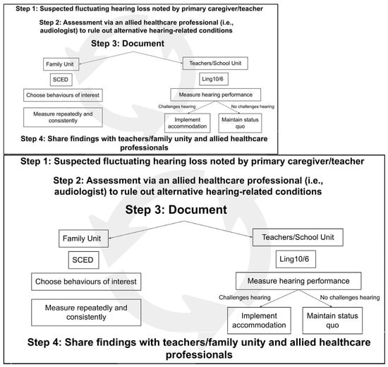 First, arrange for a full diagnostic hearing assessment with a medical professional (e.g., audiologist) as soon as possible. Once a hearing loss is confirmed to be fluctuating and conductive secondary to OM: (1) identify and list all the primary and secondary caregivers in a child’s life, (2) choose the documentation tool(s), (3) consistently measure and document the chosen behaviors, (4) share the documentation with all identified caregivers, and (5) implement the appropriate accommodations (Figure 4).