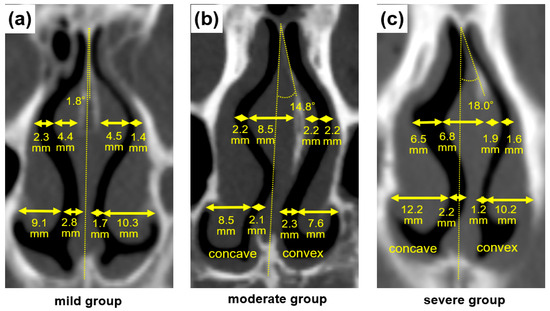 Representative examples of the measurement of the following parameters: the nasal septal angle, the width of the NSB, and the width of the upper and lower NAPs. The CT findings in the coronal section of the anterior nasal cavity show the severity of septal deviation and are categorized into three degrees as (a) mild (<9°), (b) moderate (9–15°), or (c) severe (>15°).