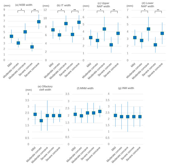 Comparison of (a) NBD width, (b) IT width, (c) upper NAP width, (d) lower NAP width, (e) olfactory cleft width, (f) MNM width, and (g) INM width between the three groups. Center squares: mean values. Error bars: standard deviations. * p < 0.05, ** p < 0.01 vs. the convex or concave sides in the moderate and severe groups. INM: inferior nasal meatus, IT: inferior turbinate, MNM: middle nasal meatus, NAP: nasal airflow passage, and NSB: nasal septal body.