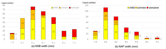 Next we investigated whether the morphological configurations of the NSB and NAP are influenced by the severity of septal deviation for each nasal cavity. Figure 5 depicts the proportional distribution of the three NSD groups categorized by the NSB width and the NAP width in 1 mm increments. The NSB width distribution exhibited a moderate peak, with the most frequent range at 3–5 mm. Of the 304 sides, 195 (64.1%) fell within this range. The NAP width distribution showed a sharper peak, with the most frequent range at 2–4 mm, accounting for 236 of the 304 sides (77.6%). Regarding the relationship with septal morphology, 88 cases were in the mild group, and 64 cases were in either the convex or concave groups. A higher proportion of the convex group was associated with a narrower NSB or NAP width, whereas a higher proportion of the concave group was associated with wider widths.