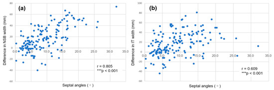 The correlations between the nasal septal angles and (a) the difference in the NSB width and (b) the difference in the inferior turbinate (IT) width between the right and the left nasal cavities for each patient. *** p < 0.001.