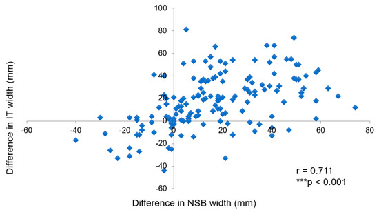 The correlation of the differences in width between the NSB and IT of the right and the left nasal cavities for each patient. *** p < 0.001.