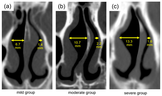 The nasal septal angle was measured to evaluate the severity of NSD for each side of the nasal cavity. The septal angle was defined as the angle formed by a line connecting the roof of the nasal cavity to the premaxilla and another line connecting the roof of the nasal cavity to the most prominent point of the nasal septum at the convex side [10,11]. The severity of NSD was categorized into three degrees as mild (<9°), moderate (9–15°), or severe (>15°) based on these measurements [12,13]. We then classified the nasal cavities into three groups based on the degree of the patients’ NSD: mild, convex, and concave groups, as follows. Both nasal cavities were classified in the mild group when a case showed mild NSD. When a case showed either moderate or severe NSD, the convex side of the nasal cavity was classified in the convex group, and the concave side was classified in the concave group.