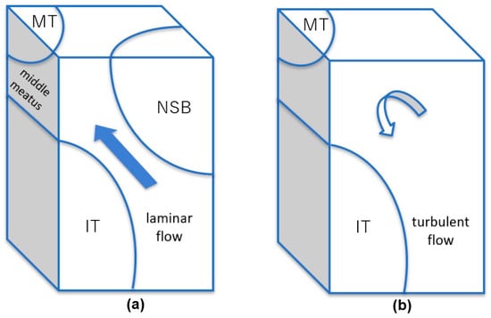Proposed roles of the NSB to maintain physiological nasal airflow. (a) The presence of the NSB enables the inspiratory airflow from the nostril to pass through a parallel space. This configuration maintains a laminar flow toward the middle nasal meatus. (b) The absence of the NSB causes a lack of parallel structure and generates a turbulent flow in the enlarged space. IT: inferior turbinate, MT: middle turbinate.