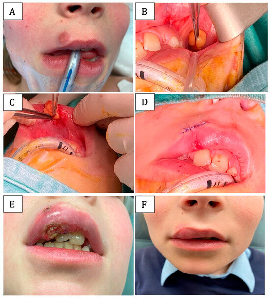 An 8-year-old female had a 10 × 10 mm mass just above the vermilion border of the right upper lip (