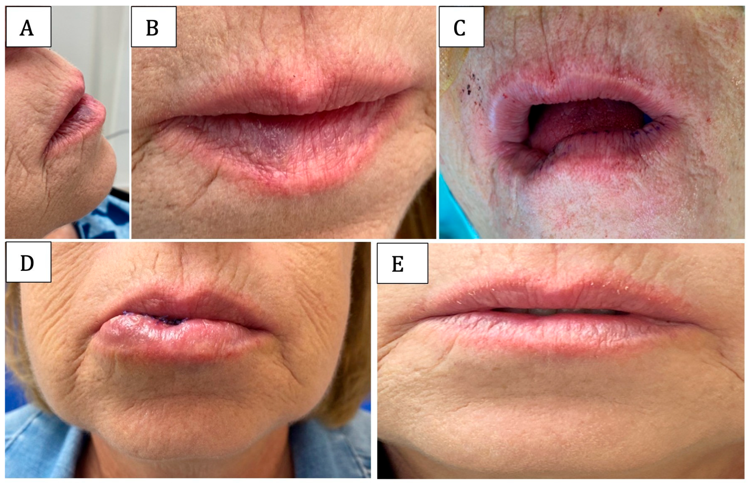 7], which plays a role in its long-term stability. However, based on our patients’ subjective complaints, it could also cause lip rigidity. The rigidity did not affect the function in all of the reported cases. Still, it contributed to better anterior lip sealing, thus preventing drawling and improving speech and swallowing in cases where late-stage defect reconstruction was performed (cases 3, 4, and 5). The microenvironmental conditions of the lip region provide unique advantages for graft integration. The oral cavity’s physiological conditions, mechanical stimulation from normal function, and rich stem cell niche create a supportive environment. Saliva exposure and absence of tissue tension when properly positioned contribute to enhanced healing and superior long-term stability.