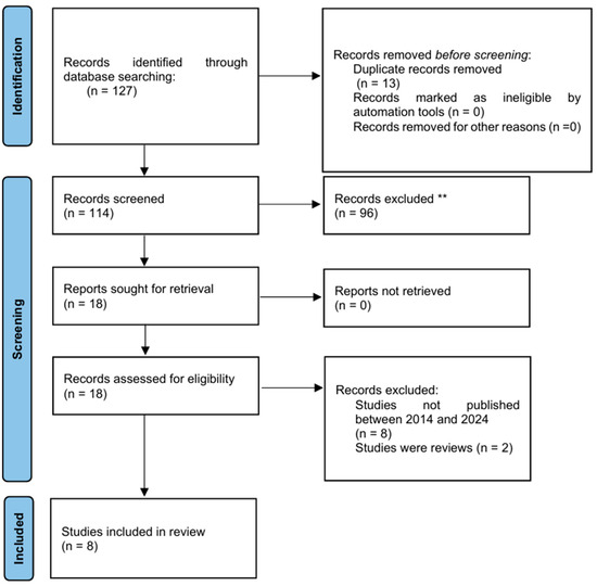 Figure 1 shows the PRISMA flow diagram that was used for the selection of the studies. Following a search strategy, a total of 127 publications were initially identified on the databases. A total of 13 duplicates were removed, and thereafter titles and abstracts of the publications were screened resulting in 96 publications being removed. Eighteen full-text articles were evaluated for eligibility and this led to a further removal of ten articles with reasons, resulting in a total of eight articles included for the review. Eight articles were removed as they were not published between 2014 and 2024, and two review papers were also removed.