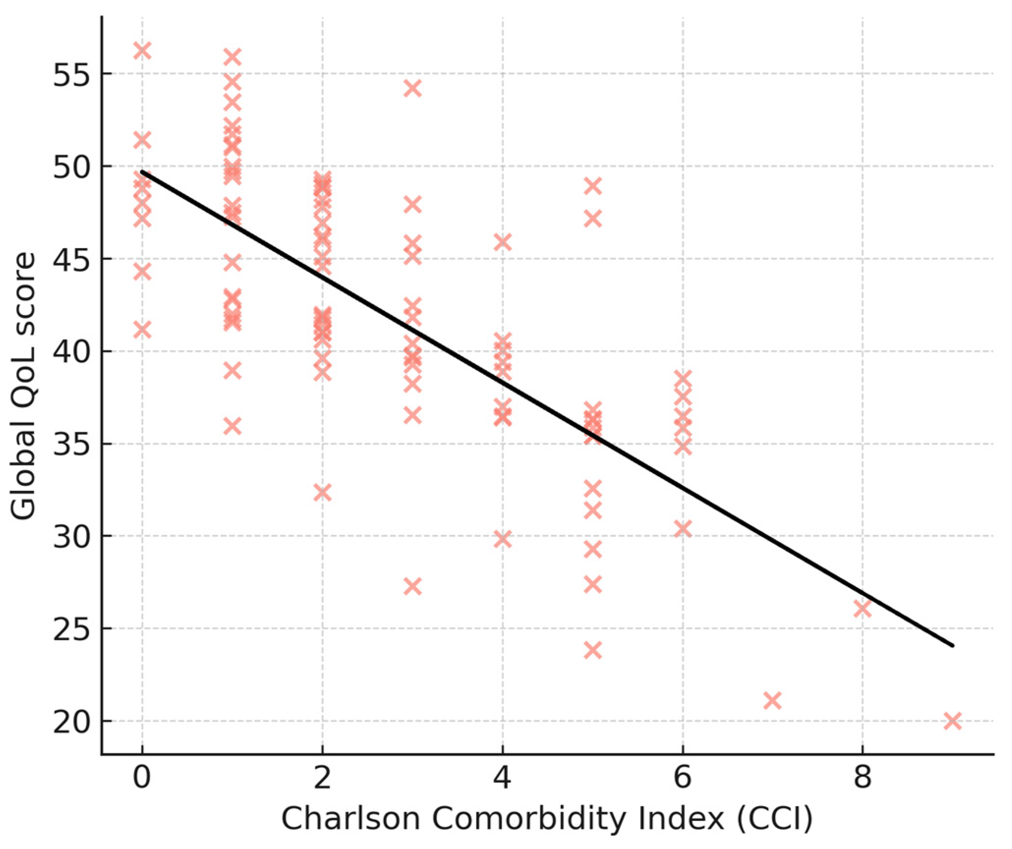 - Spearman’s rank correlation for associations between continuous variables (age, CCI, QoL).