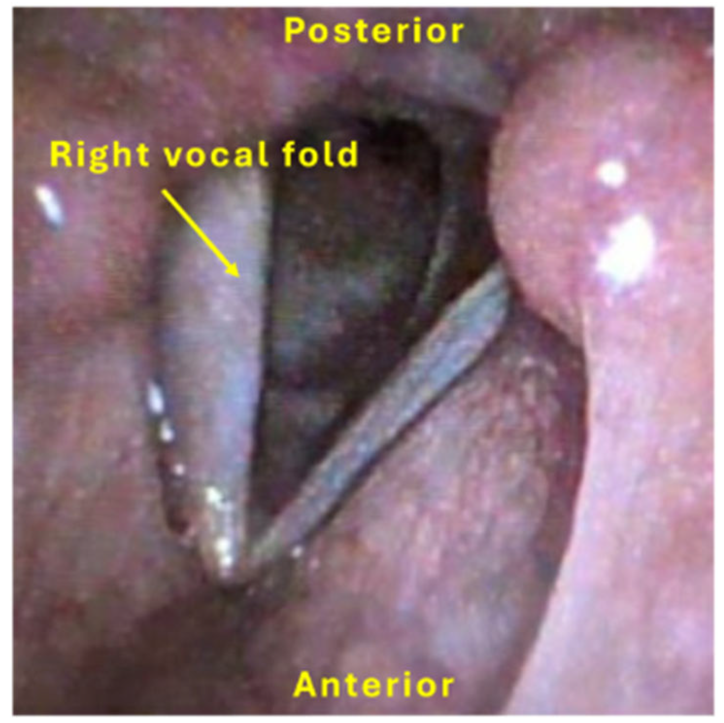 - Pattisapu, P.; Donovan, D.T. Osteophyte causing direct compressive paralysis of recurrent laryngeal nerve. Otolaryngol. Head Neck Surg. 2019, 161, 183–184. [Google Scholar] [CrossRef]