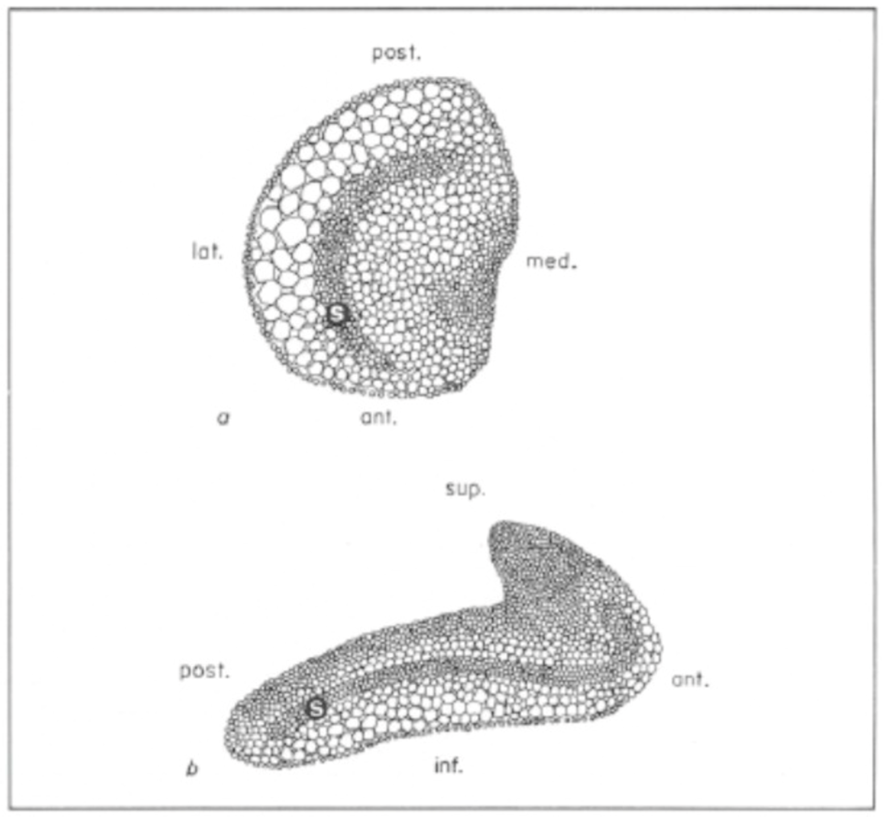 Figure 3. Regional distribution of the otoconial layer and the striolar zone in the human otolith maculae (schematic). (a) Utricular macula showing the regional distribution of the otoconial layer and the location of the striolar zone (S) relative to surrounding extrastriolar regions (orientation: ant., post., lat., med.). (b) Saccular macula showing the regional distribution of the otoconial layer and the location of the striolar zone (S) relative to surrounding extrastriolar regions (orientation: sup., inf., ant., post.). In both maculae, the striola represents a distinct central zone compared with extrastriolar areas, consistent with regional differences in mechanical coupling of hair bundles to the otoconial membrane and a substrate for transient/high-frequency sensitivity. Adapted with permission from Lindemann (1973) [23].