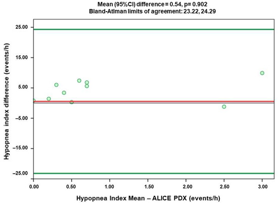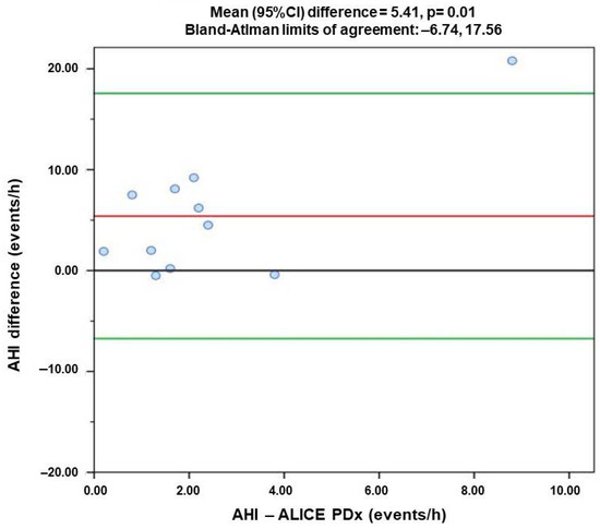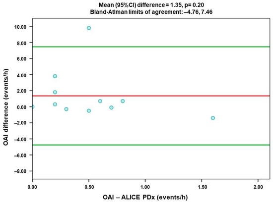 Figure 1 illustrates the Bland–Altman analysis of AHI between the two devices. The horizontal axis represents the AHI collected by PSG via Alice PDx, while the vertical axis shows the subject-specific difference (Figure 1). There are significant differences between the two methods (t-test p = 0.01, CI 95% from 1.05 to 10.15 events/h). Our analysis also suggests a magnitude-dependent bias, with linear regression model p = 0.01. The mean difference is 5.41 events/h, and limits of agreement were from −6.74 to 17.56 (Figure 1), which is considerable and suggest that Alice NightOne may overestimate the AHI and may produce false-positive results of OSA in asymptomatic patients.