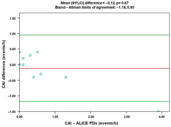 Bland-Altman plots. Distinction between the CAI-Alice PDx plotted against the two devices’ CAI difference (n = 11). The red line presents the mean difference, while the green ones reveal the limits of agreement. CAI: central apnea index.