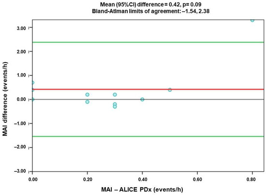 The subject difference in most cases was less than 0.5 events/h (95% CI from −0.1 to 1.75 events/h), resulting in a mean bias of 0.42 events/h. The limits of agreement were from −1.54 to 2.38 due to outliners in a small sample (Figure 4).