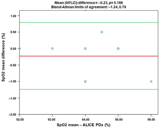 Bland-Altman plots. Distinction between the SpO2 mean-Alice PDx plotted against the two devices’ mean SpO2 difference (n = 11). The red line presents the mean difference, while the green ones reveal the limits of agreement.